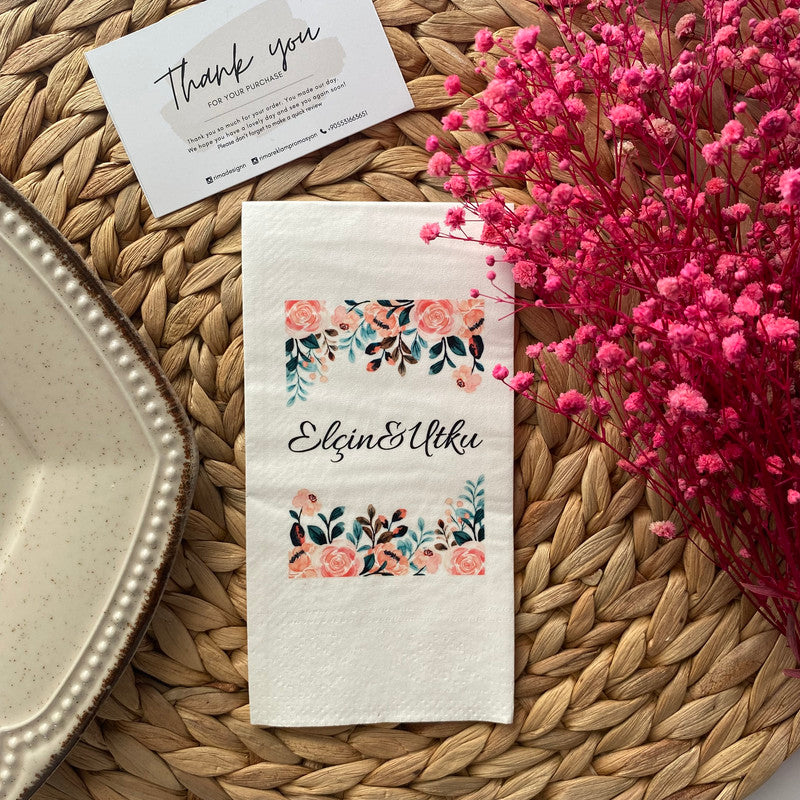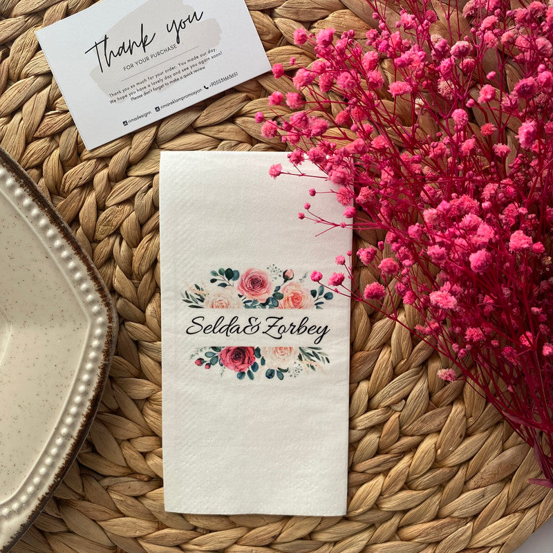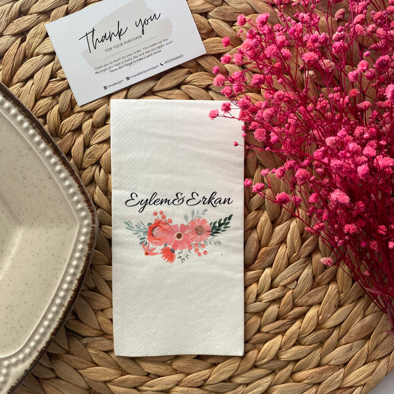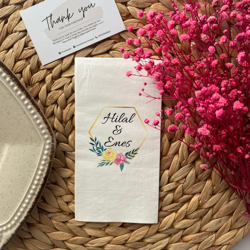 Düğün ve nişanlar için kişiye özel tasarlanmış isimli peçetelerle sunumlarınıza zarafet katın. Lüks ve şık peçetelerimizle özel günlerinizi unutulmaz kılın.