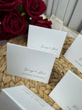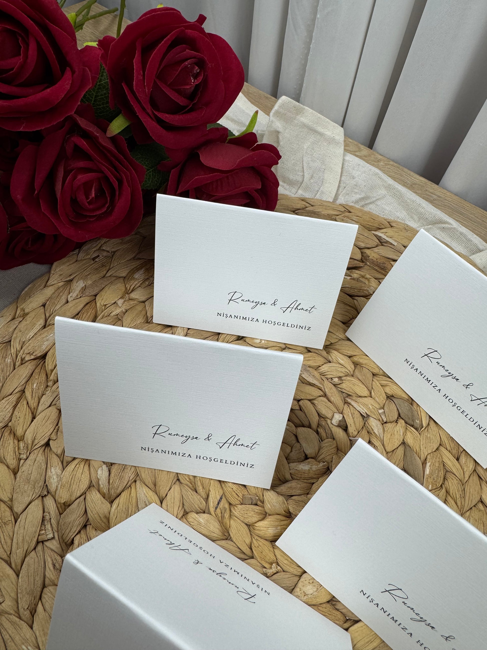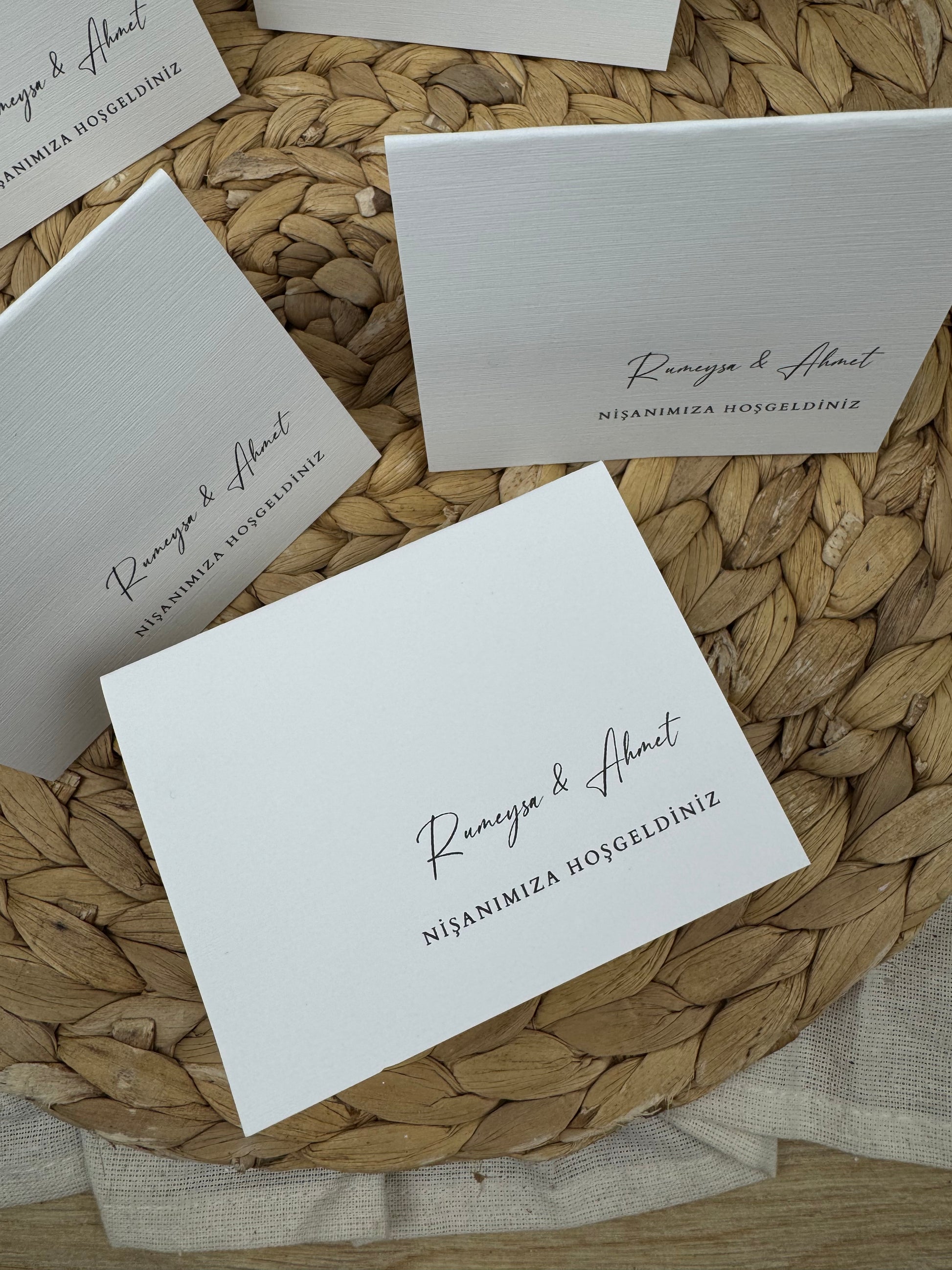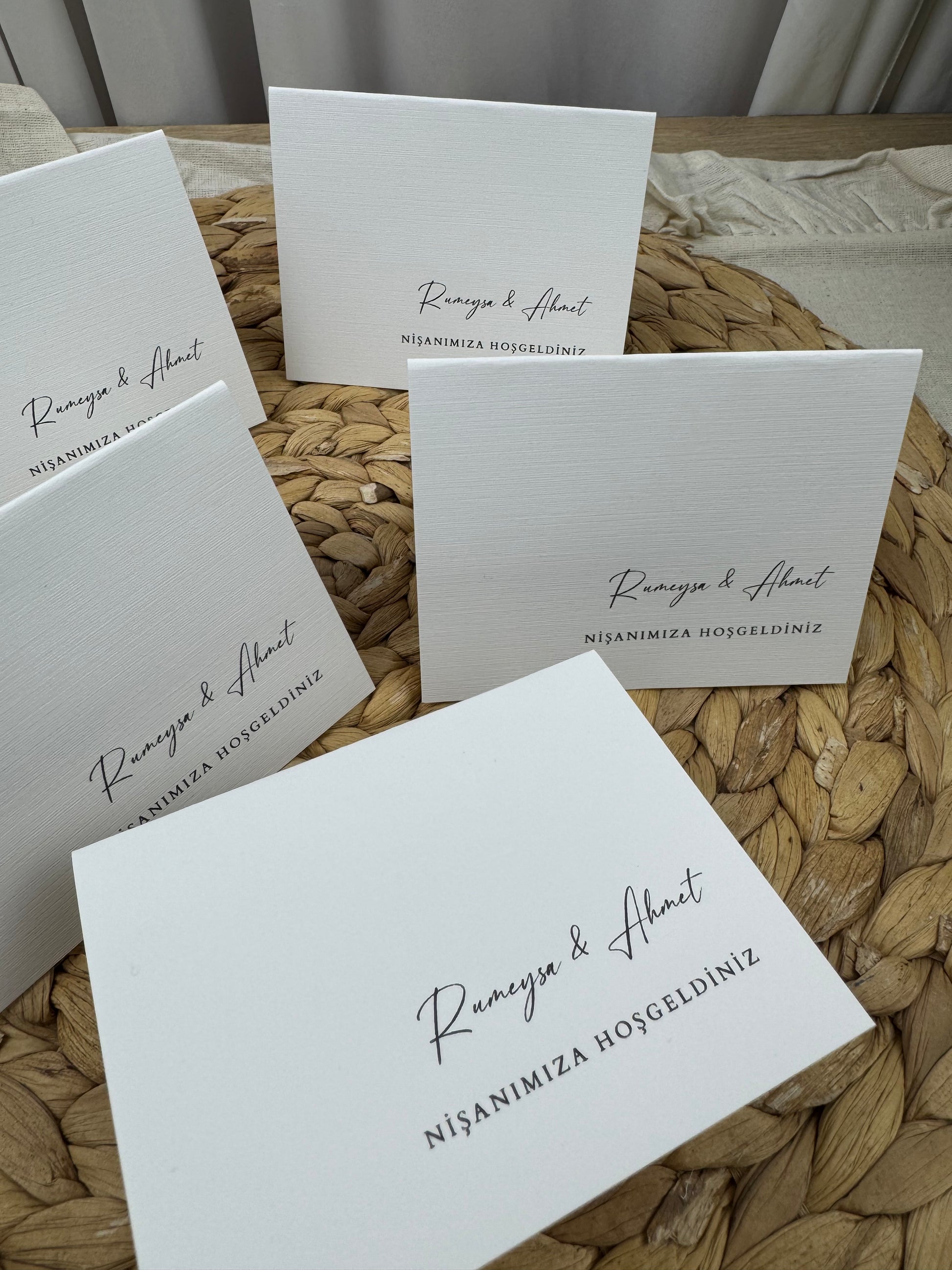 Çift taraflı baskılı A7 masa isimliklerimiz düğün dekorasyonunuzu tamamlıyor. Mat kuşe kağıda basılmış isimlikler, isim yazmak için boş alan ile gönderilmektedir. Açık olarak gönderilen isimlikler, kırımlı şekilde tasarlanmıştır.