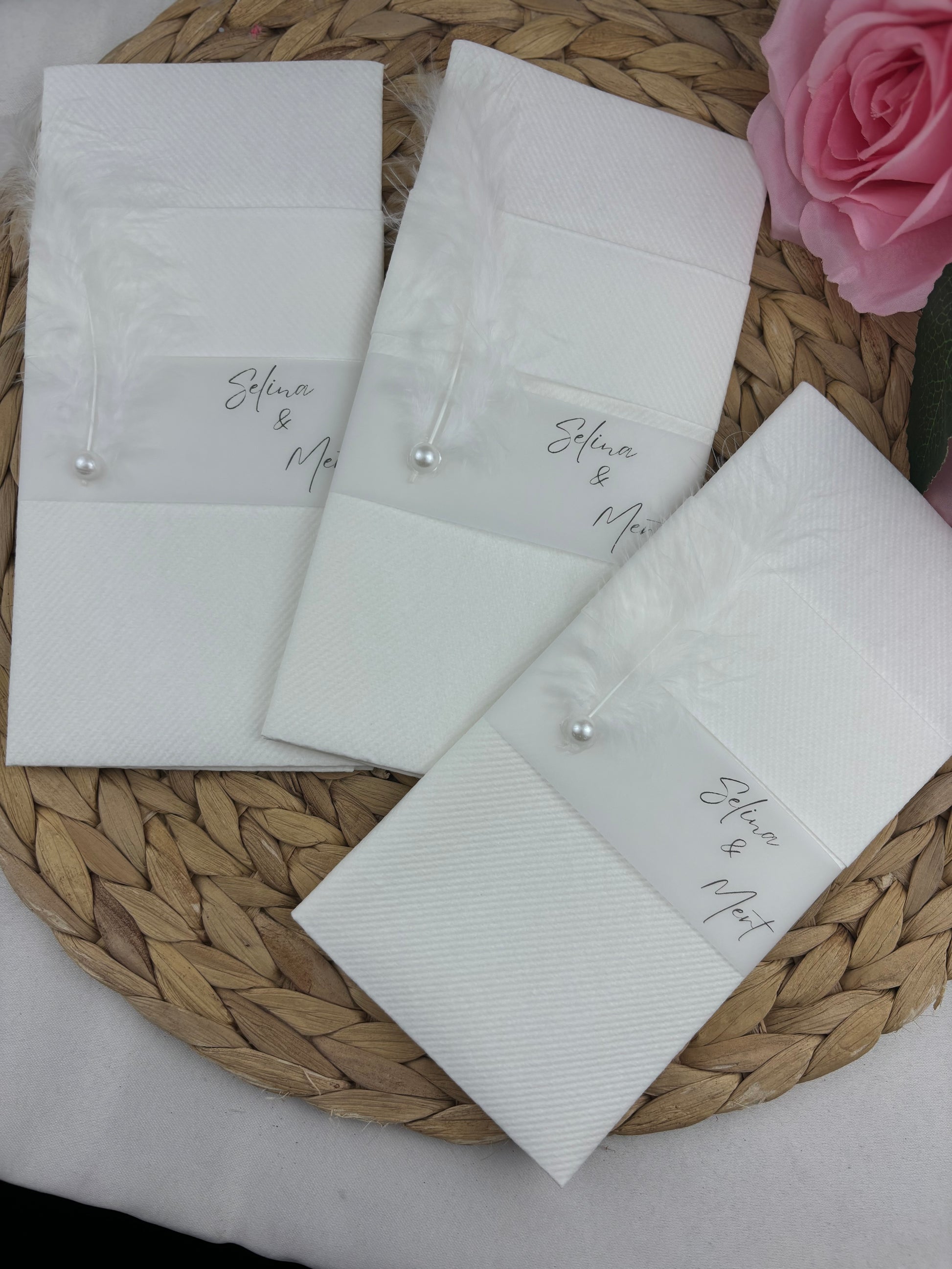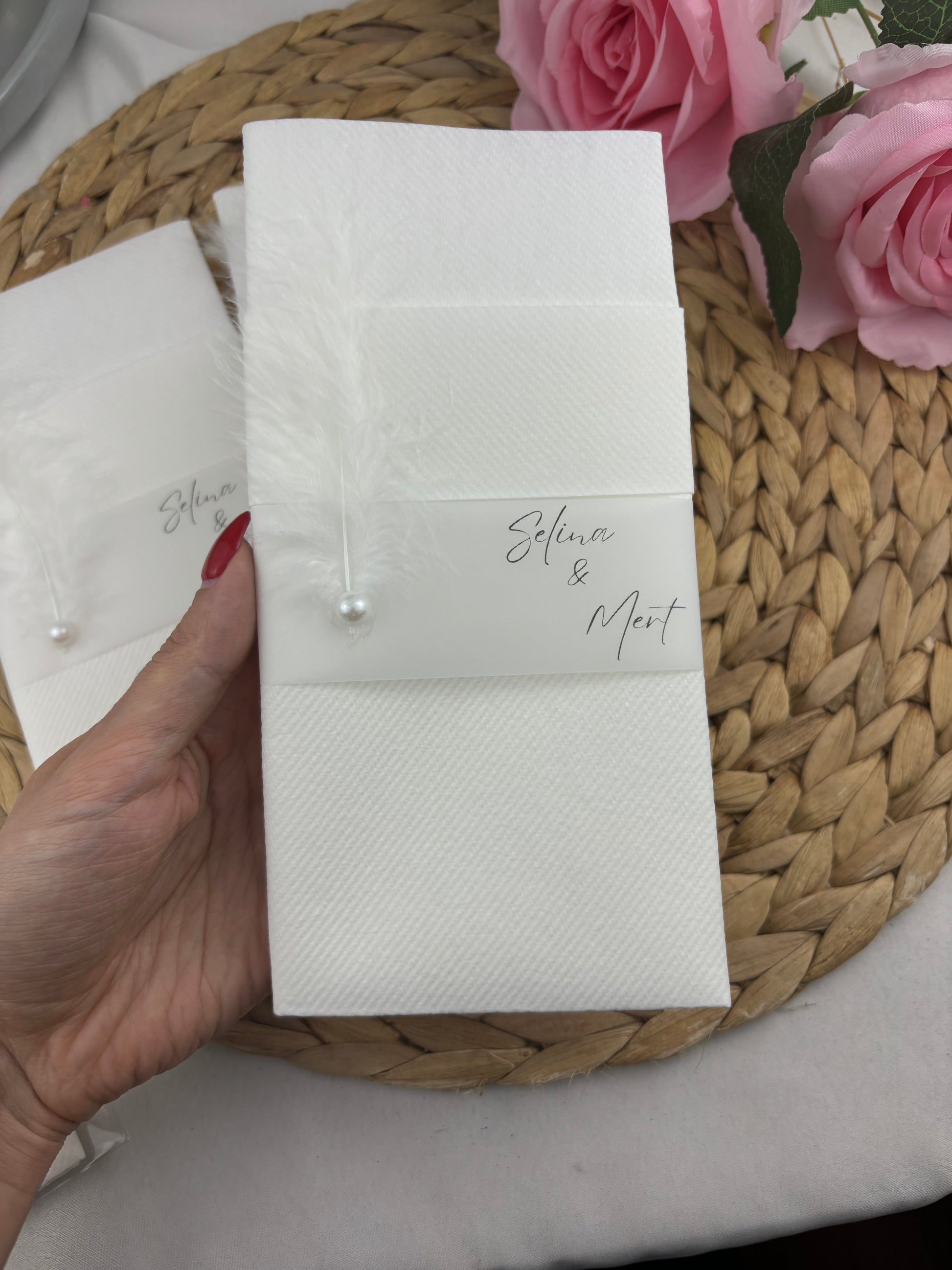 Personalisierte Luxusserviette mit Perlen- und Federdetails – Besonderes Design, Eleganz und Eleganz