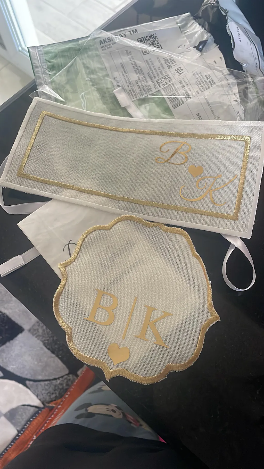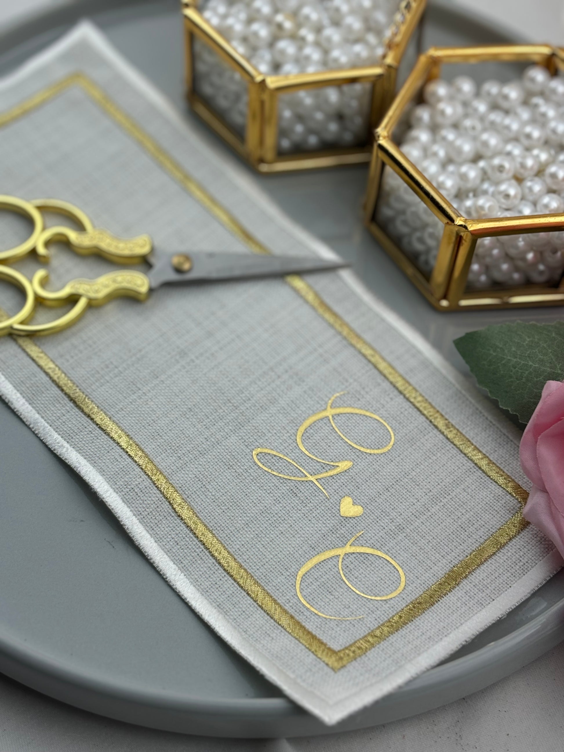24 x 10,5 cm großes Tabletttaschentuch mit bestickten Rändern und goldenen Details.