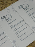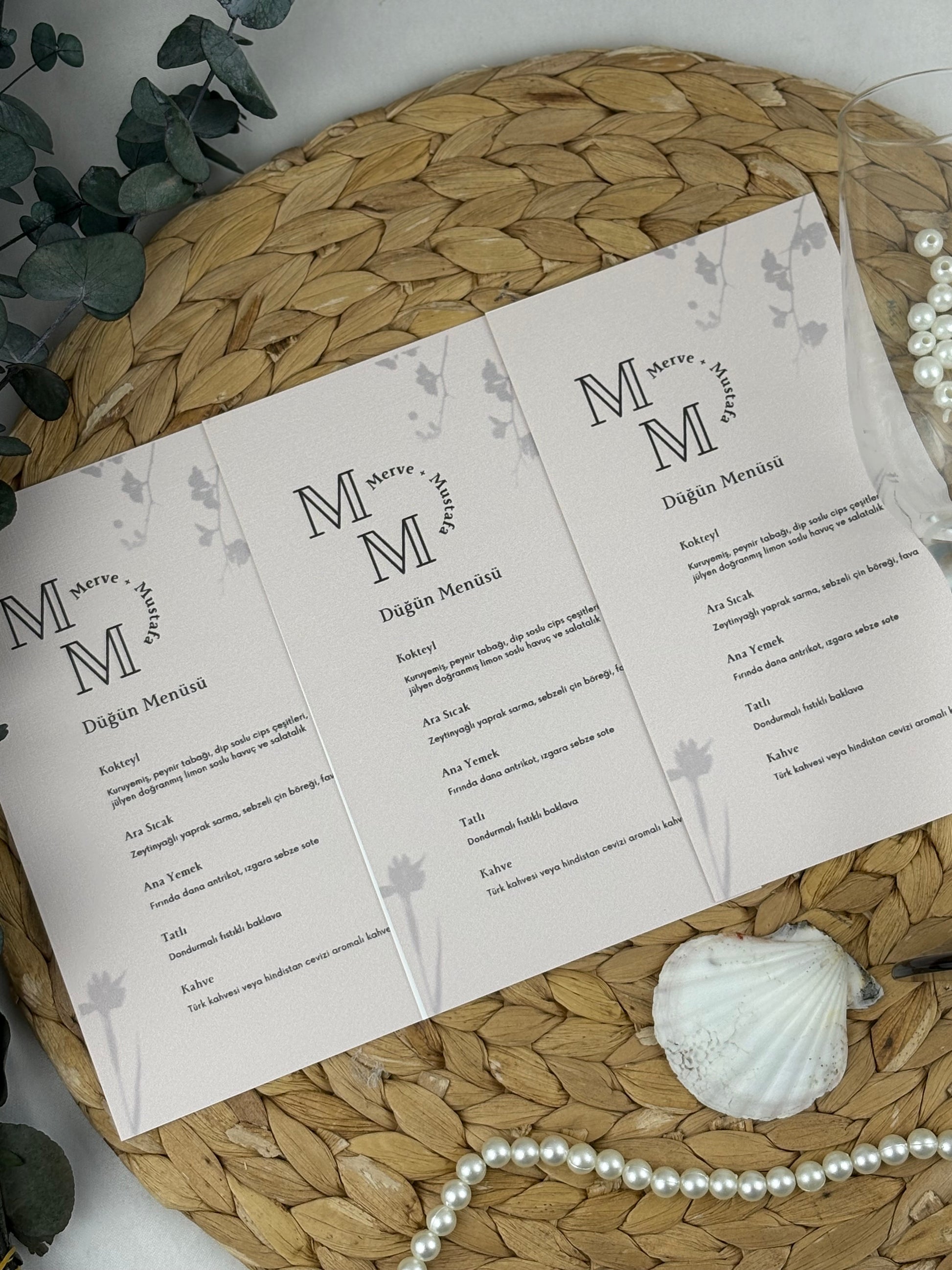 Şıklığıyla dikkat çeken bu menü kartları, 8x18 cm boyutunda olup, Amerikan Bristol kağıda baskılıdır. Özel günlerinizde davet sofralarına zarif bir dokunuş yapar.