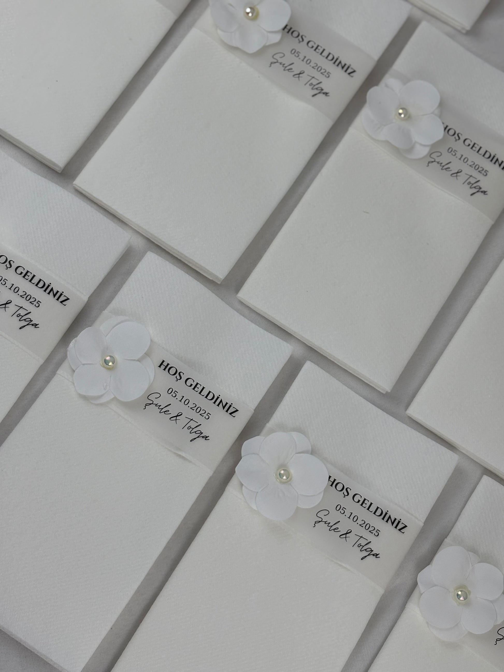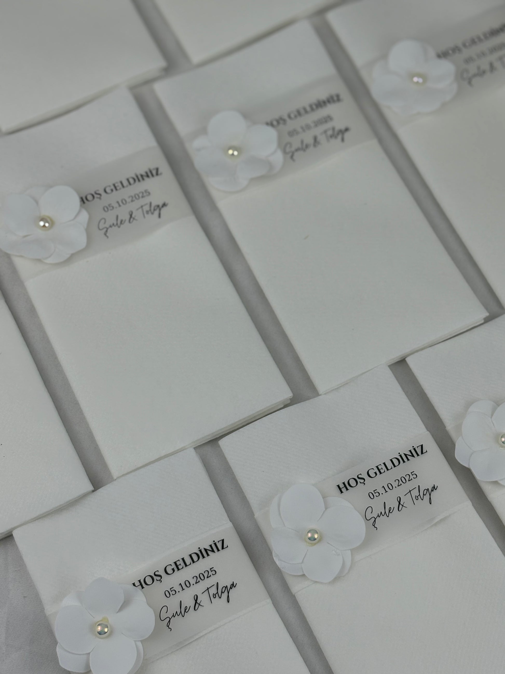 Orkide ve İnci Detaylı Cepli Nişan Peçetesi - Kişiye Özel