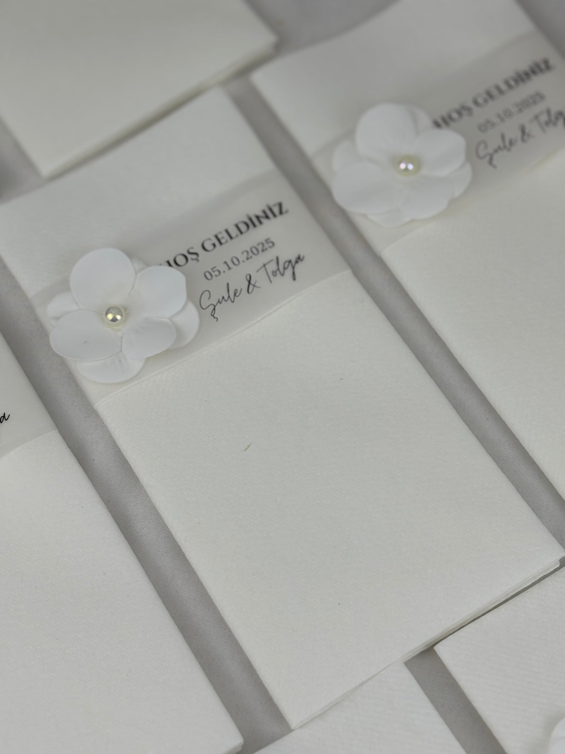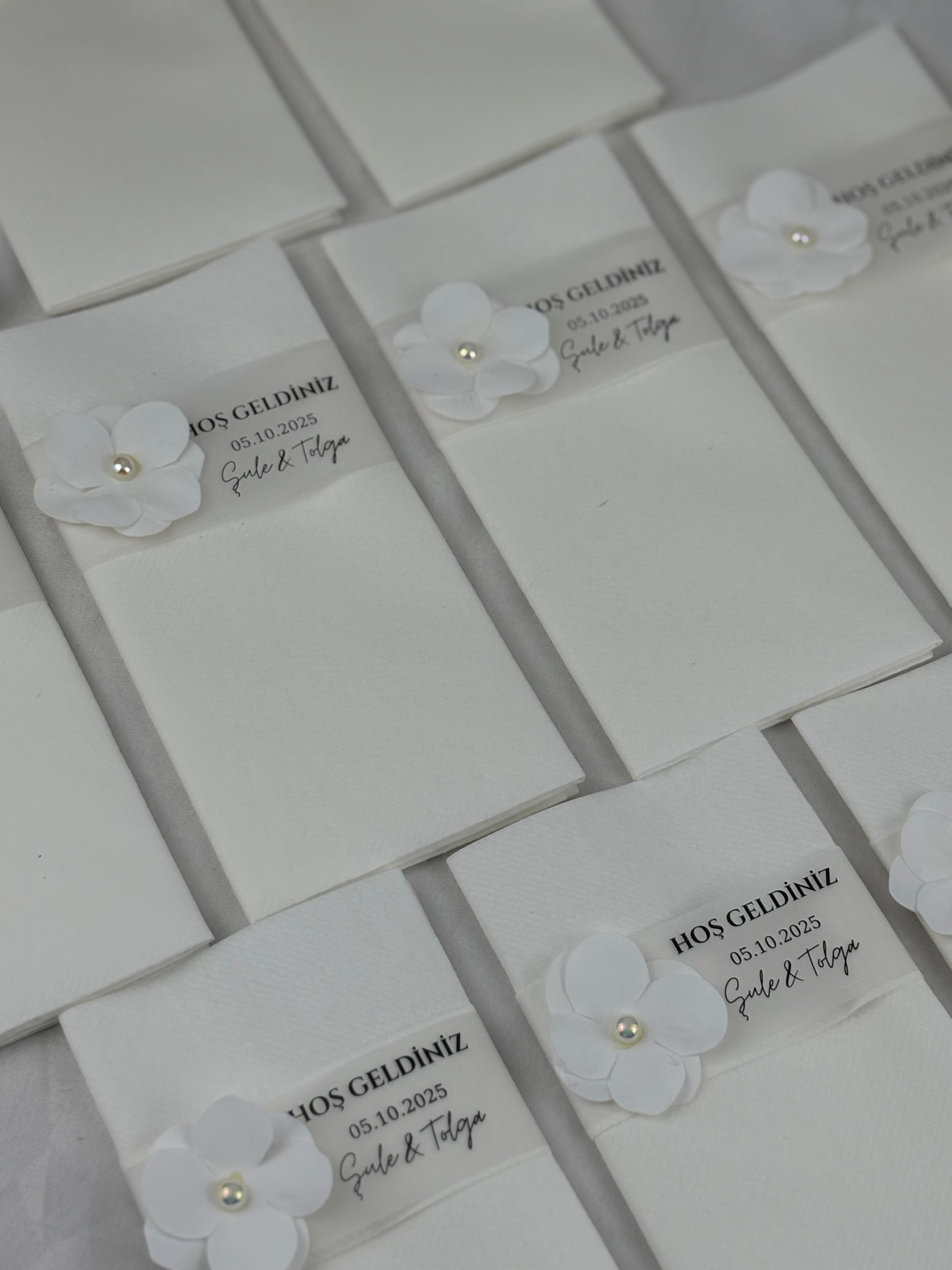 Özel günlerinize zarafet ve doğallık katmak için tasarlanmış orkide ve inci detaylı cepli nişan peçeteleri! Yüksek kaliteli, 3 katlı kumaş dokulu kağıttan üretilen bu şık peçeteler; nişan, düğün ve tüm özel davetlerinizde sofralarınıza romantik bir dokunuş katar.