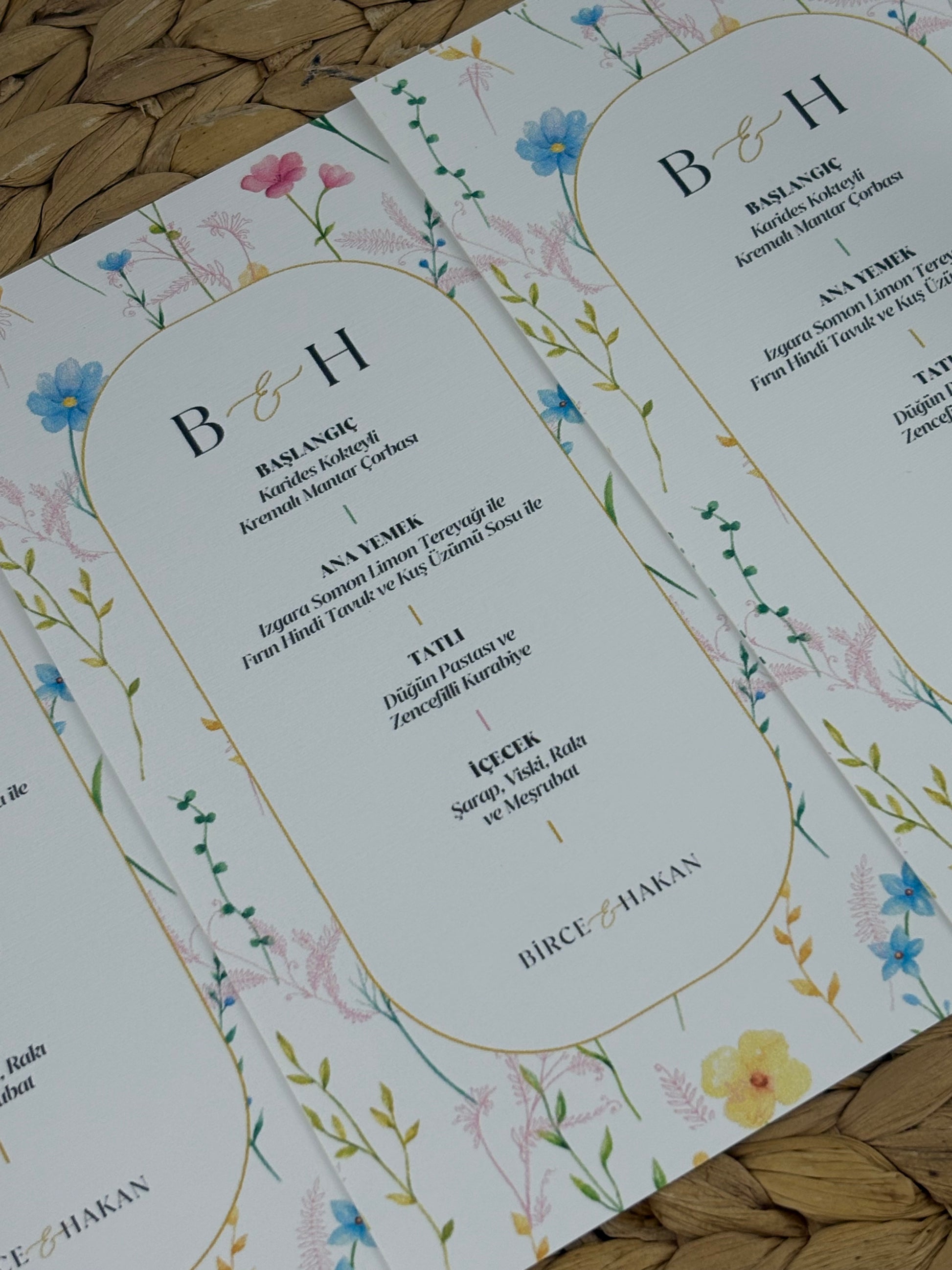 Özel organizasyonlarda sofranıza zarafet katan menü kartları, kişiye özel hazırlanır. Düğün, nişan ve davetlerinizde yemek listesini şık bir şekilde misafirlere sunar.