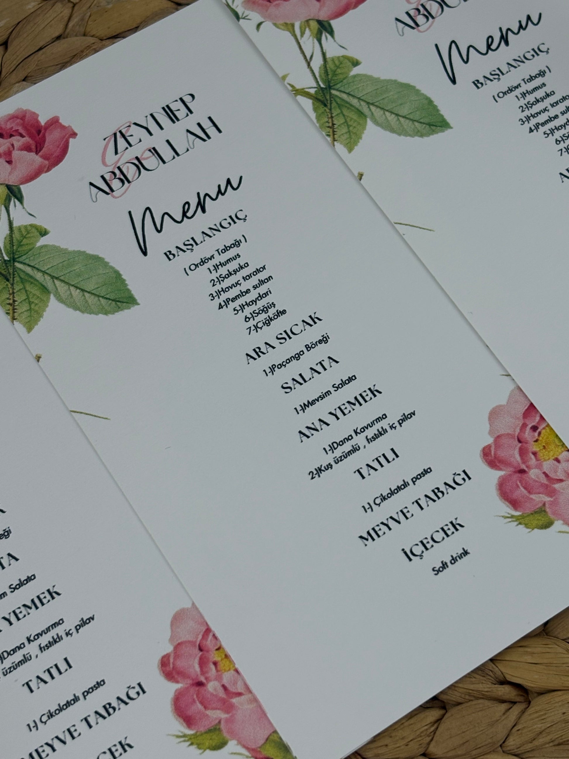 Özel organizasyonlarda sofranıza zarafet katan menü kartları, kişiye özel hazırlanır. Düğün, nişan ve davetlerinizde yemek listesini şık bir şekilde misafirlere sunar.