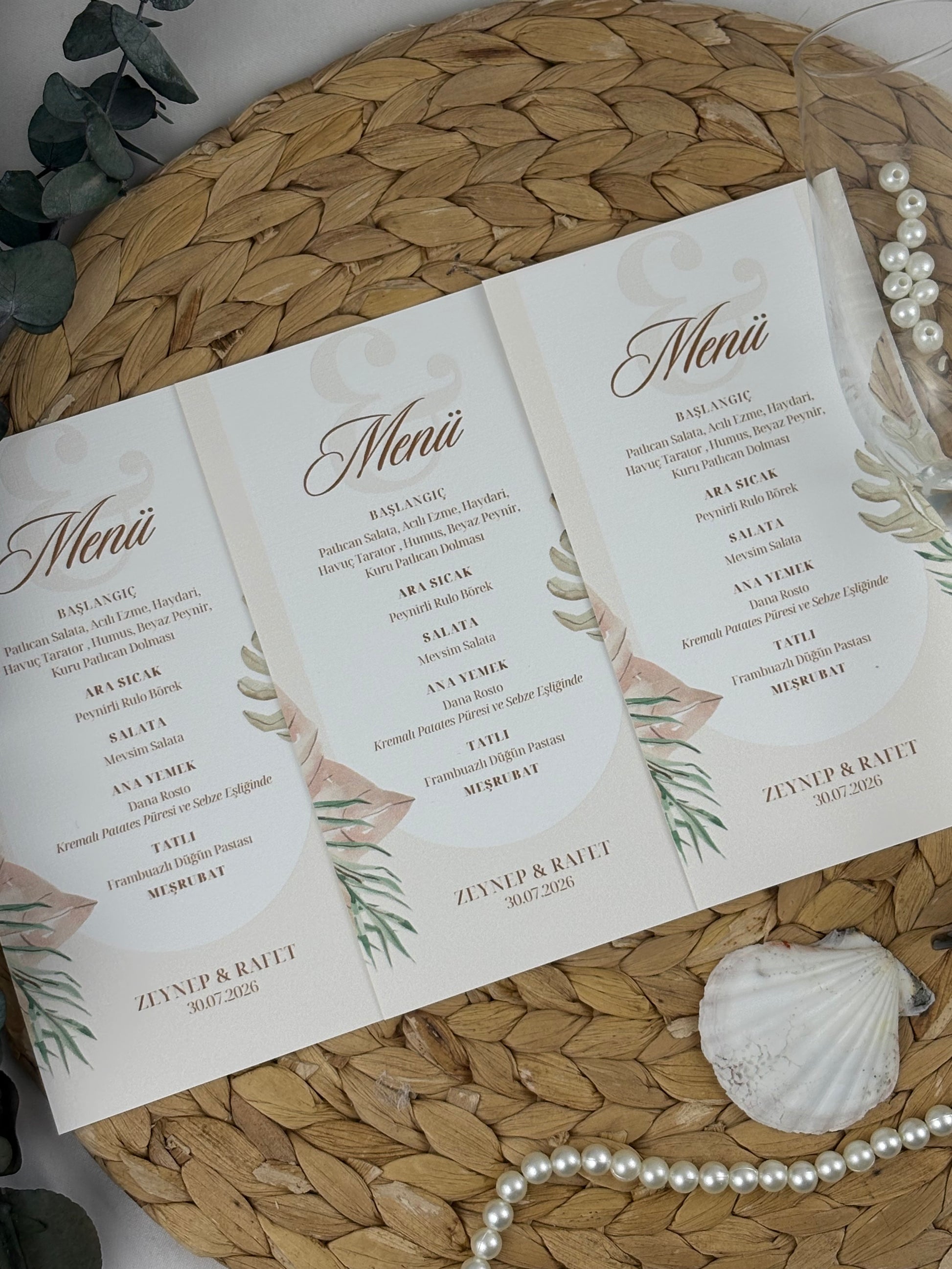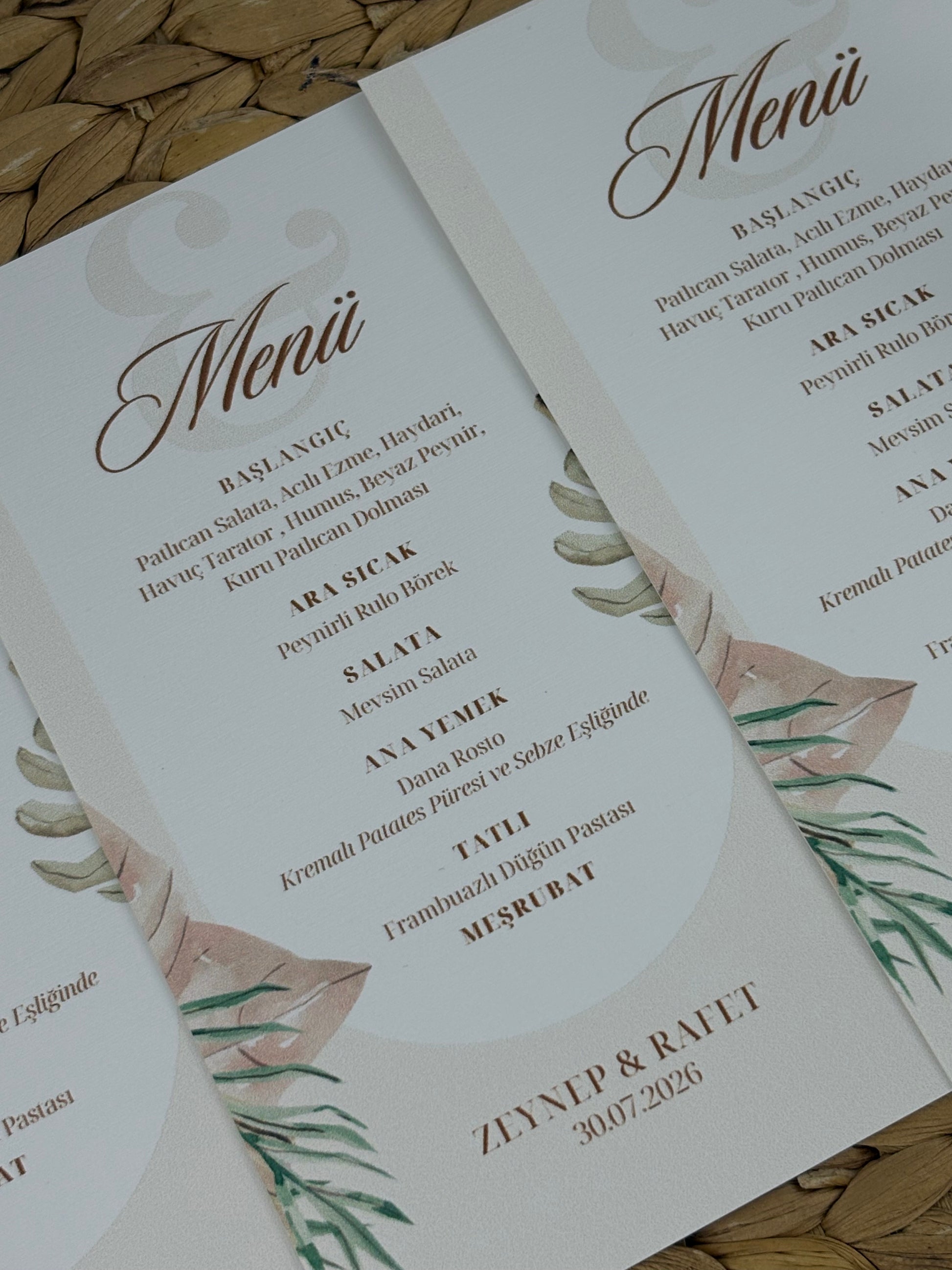 Düğün, nişan ve davet sofralarında misafirlerinize şıklık sunmak için tasarlanan menü kartları, kişiye özel baskısıyla özel günlerinize anlam katar.