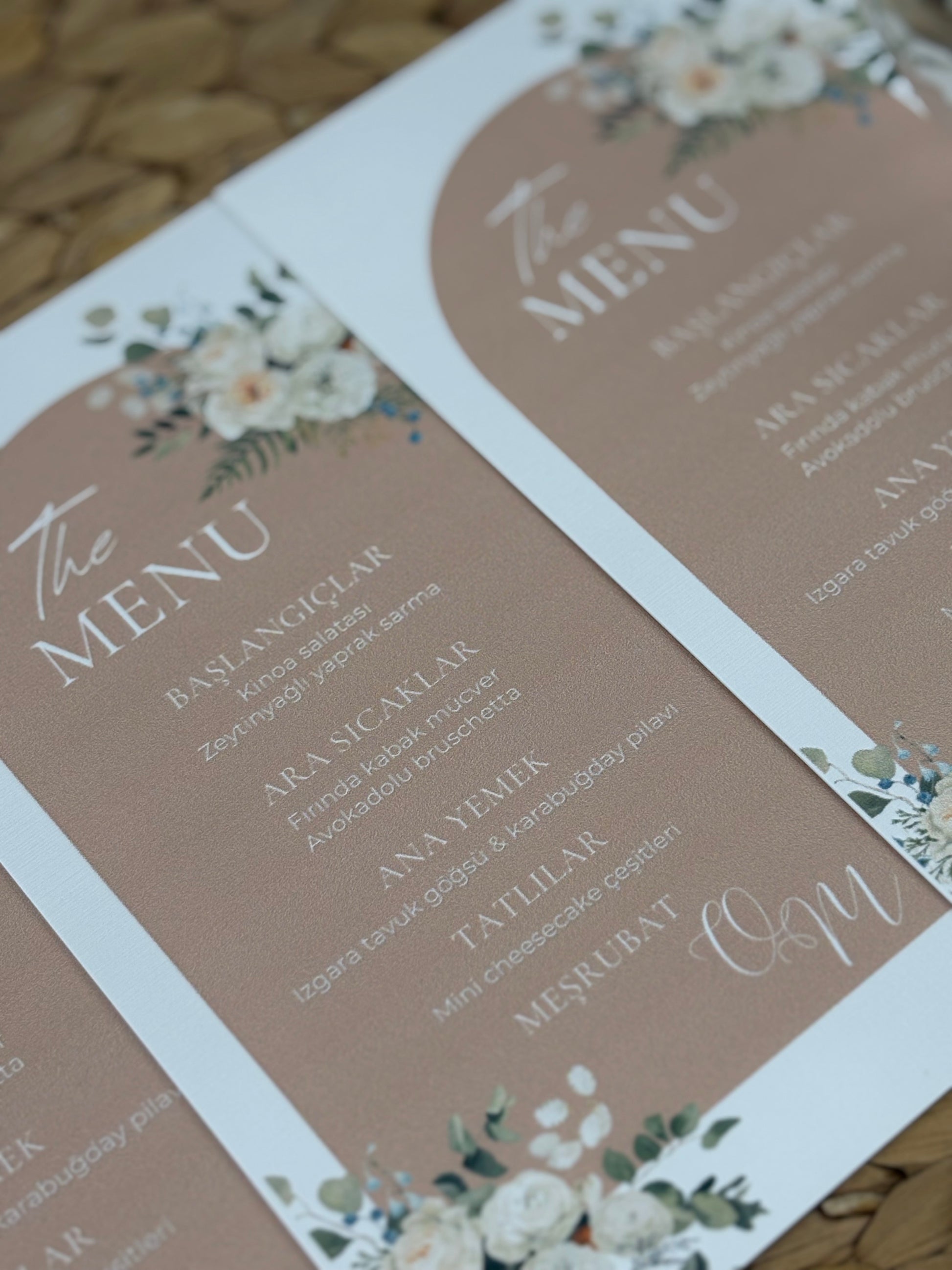 300 gr Amerikan Bristol kağıda basılan bu özel tasarım menü kartları, 8x18 cm ölçülerindedir. Düğün, nişan ve özel davetlerde sofralarınızı zarafetle tamamlar.