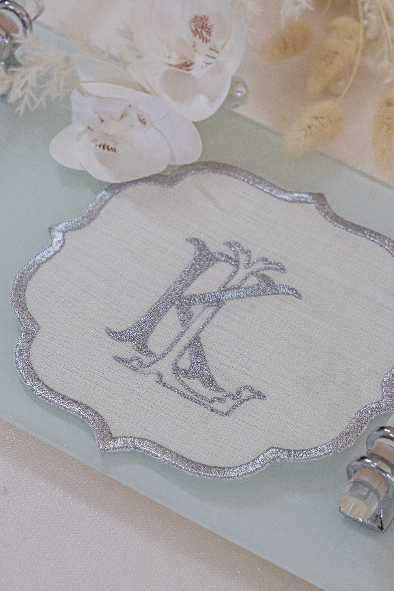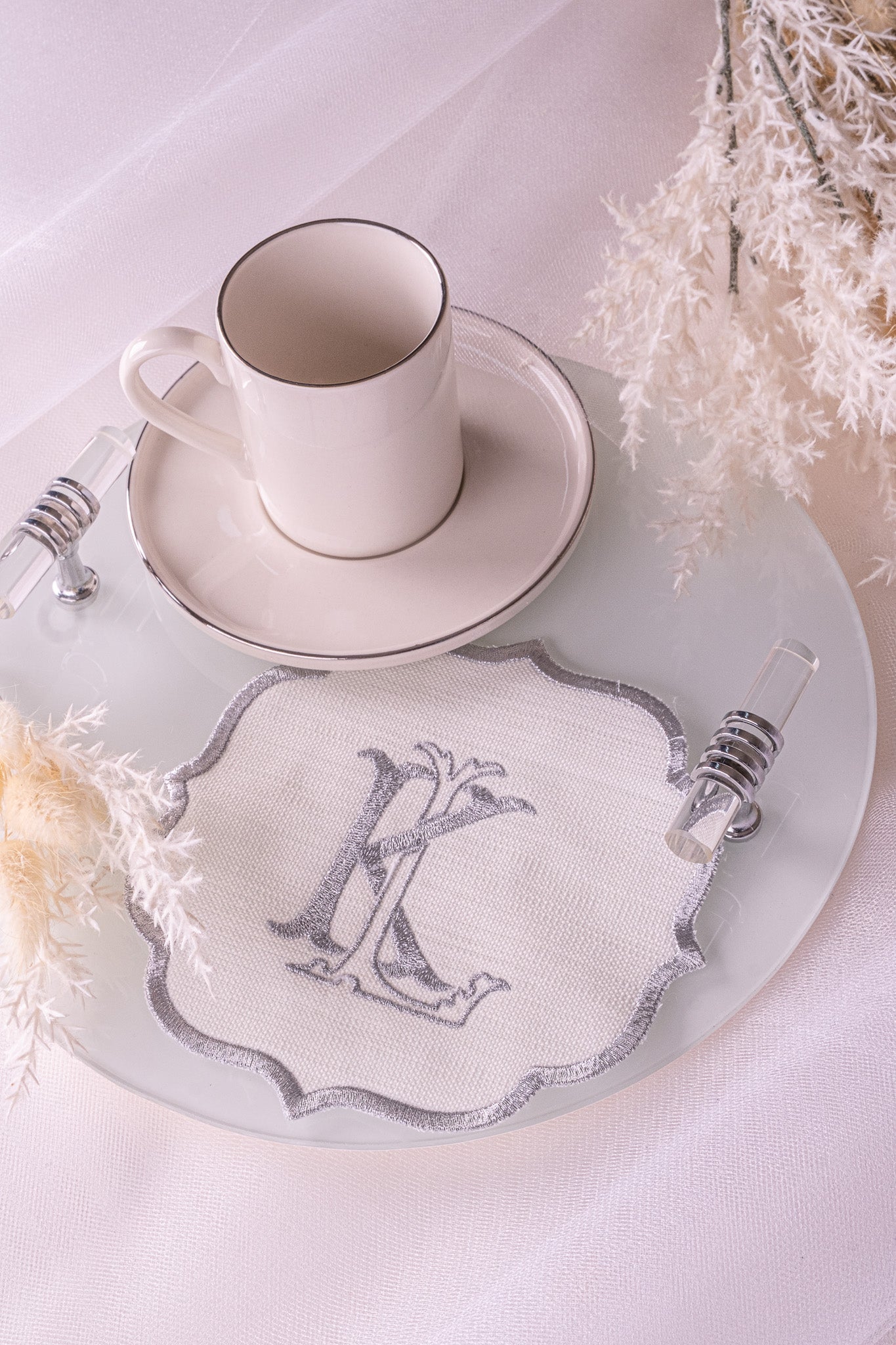 Kişiye Özel Gümüş Monogram Nakışlı Keten Damat Fincanı Altlığı