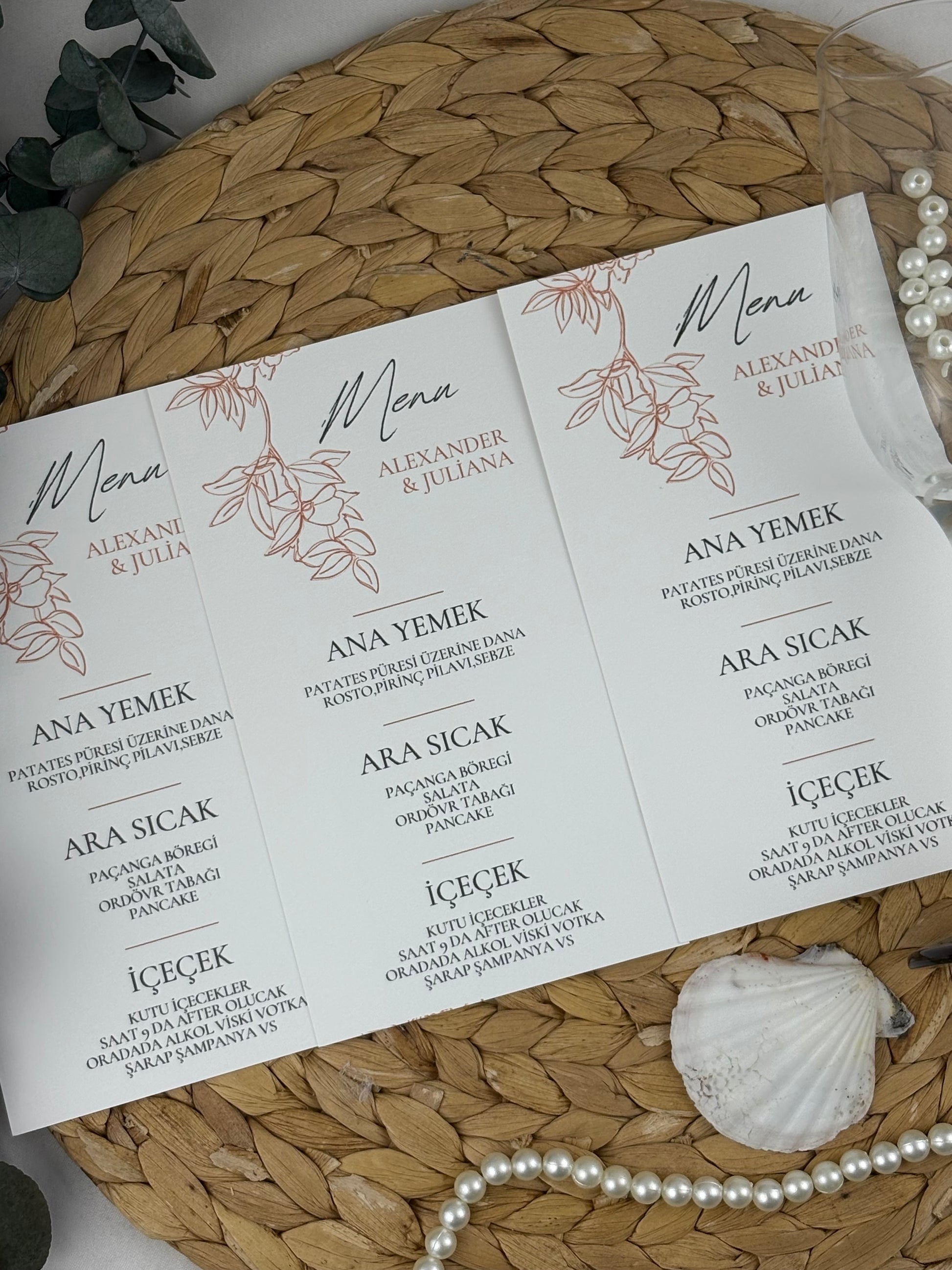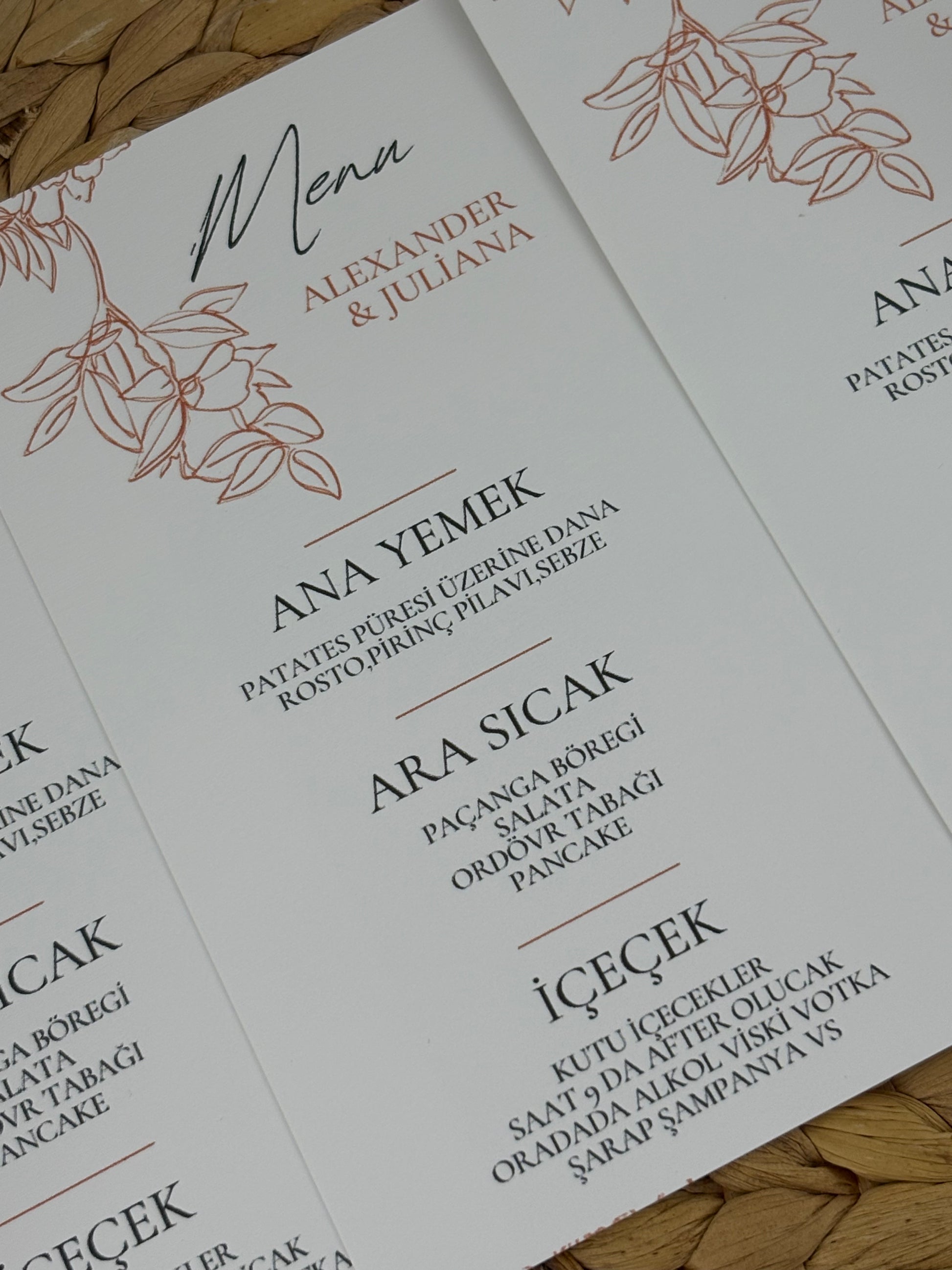 Şık tasarımıyla dikkat çeken menü kartları, özel günlerde misafirlerinize sunacağınız yemek listesini estetik bir şekilde sergiler. Düğün, nişan ve tüm davetlerde masaların vazgeçilmez tamamlayıcısıdır.