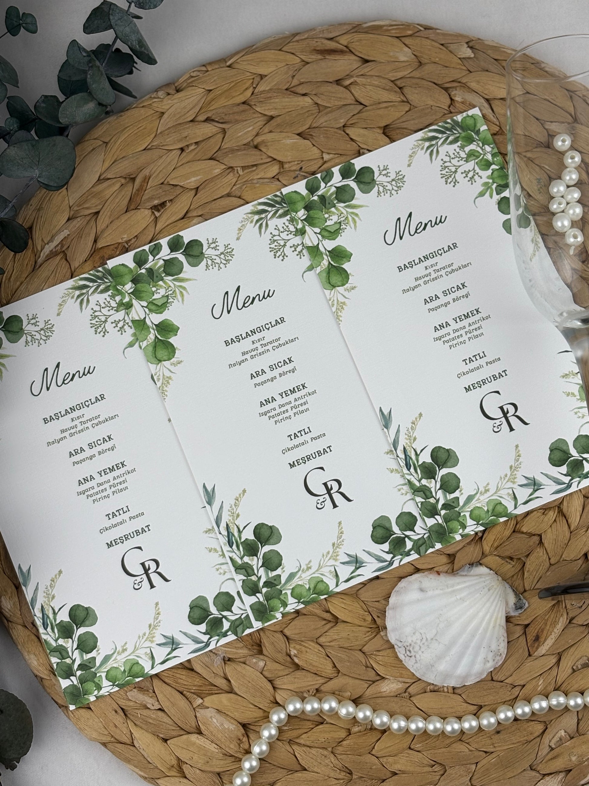 Düğün ve nişan sofralarınıza şıklık katmak için tasarlanan menü kartları, yüksek kaliteli Amerikan Bristol kağıda baskı yapılmaktadır. 8x18 cm ölçüsüyle masalarınıza uyum sağlar.