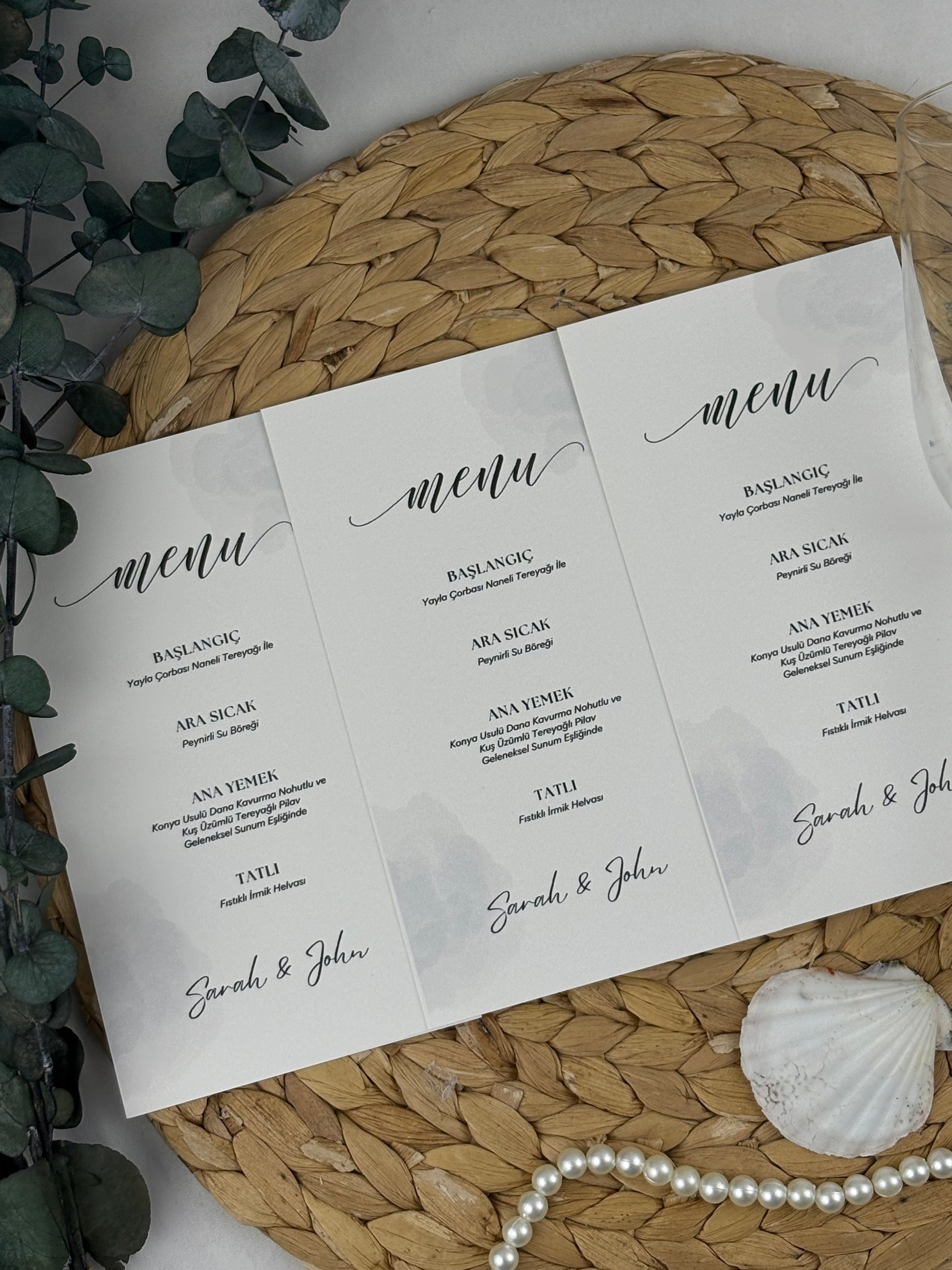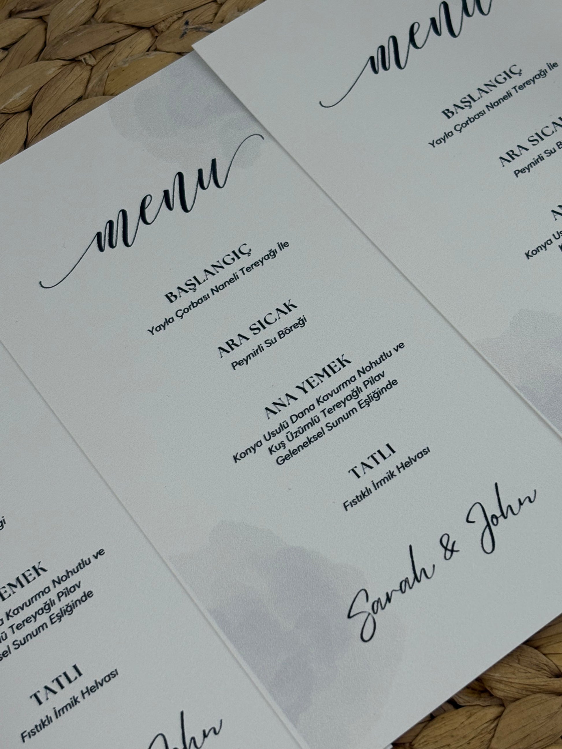 Düğün, nişan ve diğer davetlerde sofralarınıza şıklık katacak olan menü kartları, kişiye özel tasarımıyla masalarda estetik bir görünüm oluşturur.