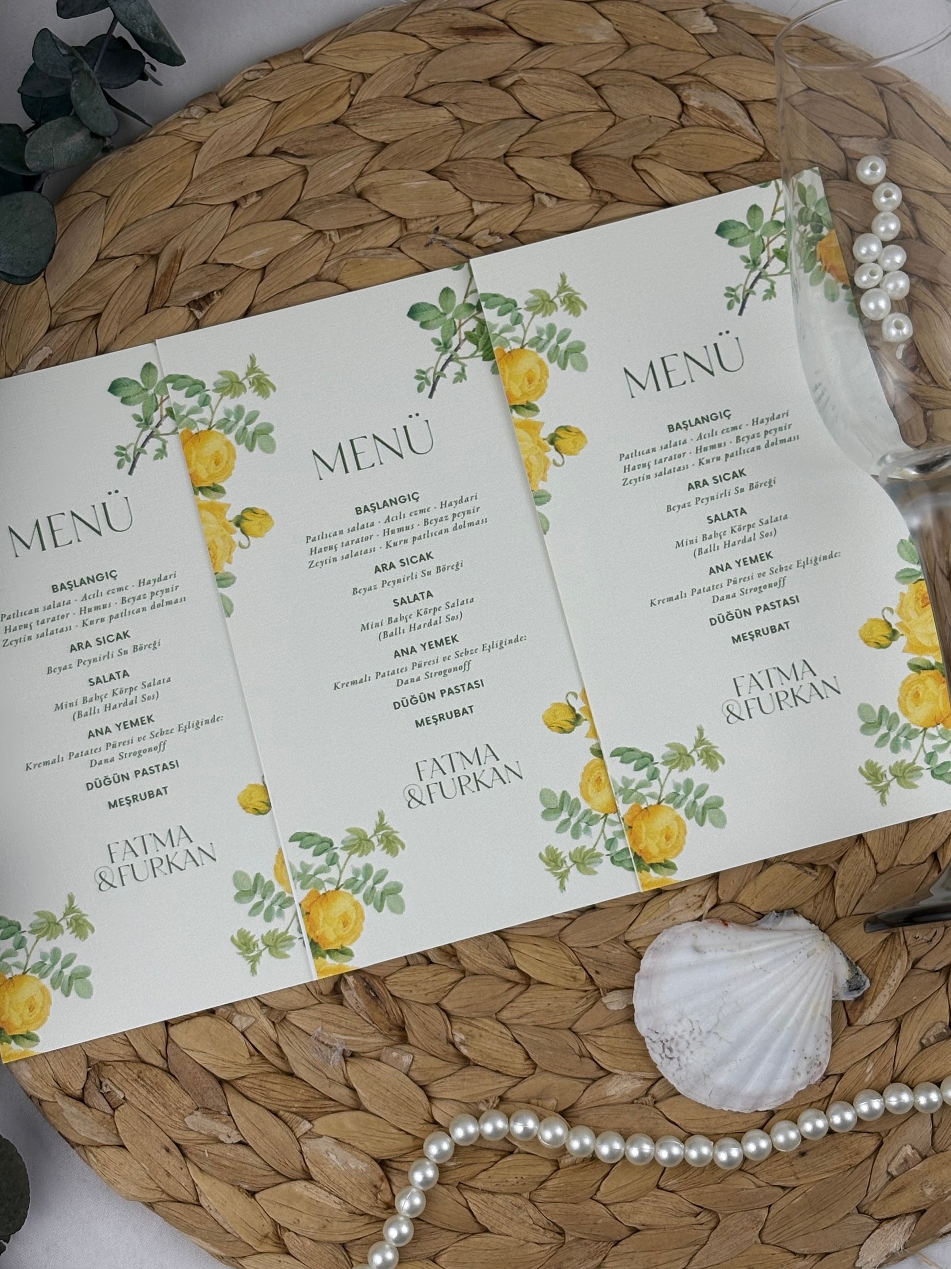 Nişan ve düğün sofralarında kullanılan özel tasarım menü kartları, yemek listesini estetik bir biçimde sergileyerek masalara zarafet katar. Özel günlerinize uyum sağlayan şık bir detaydır.